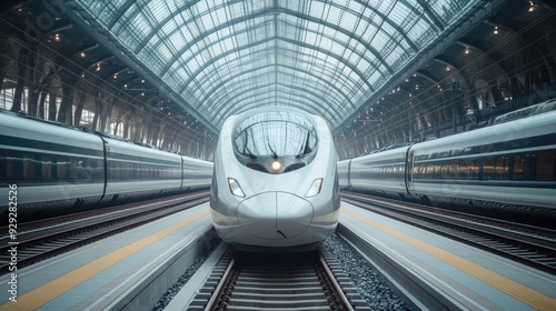 High-Speed Train in Modern Station with Futuristic Architecture and Clear Skylight