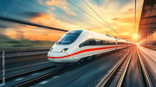High-speed train, white and red color scheme, speeding along the track, sunset sky in the background