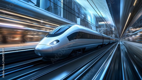High-Speed Train Zooming Through Futuristic Urban Cityscape with Dynamic Motion Blur