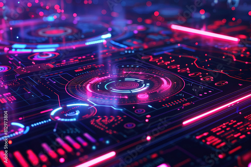 High-tech AI interface with floating holographic data points, interactive and dynamic display, neon colors