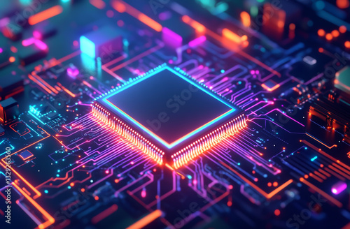 "High-Tech Chip and Circuit Board with Glowing Neon Lights Illuminating Dark Space"