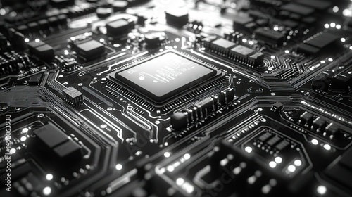 High-Tech Circuit Board Close-Up, Macro View of Semiconductor Chips and Motherboard Technology