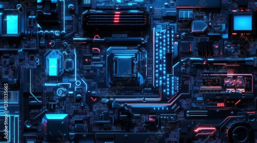 High-tech circuit board with glowing components and intricate designs in a futuristic setting