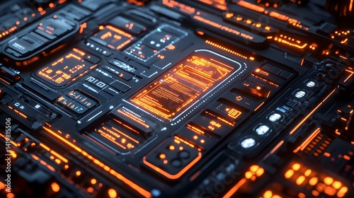 High-tech circuit board with illuminated displays.