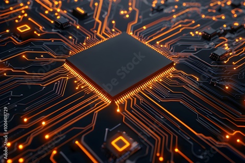 High-tech circuit board with illuminated pathways, glowing orange and yellow lights, advanced microchip technology, abstract futuristic design