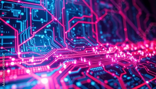 high-tech circuit board with shimmering red and purple data trails interconnected nodes and bright pathways forming a complex and visually striking network
