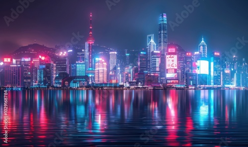 High-tech city skyline with holographic advertisements, 4K hyperrealistic photo