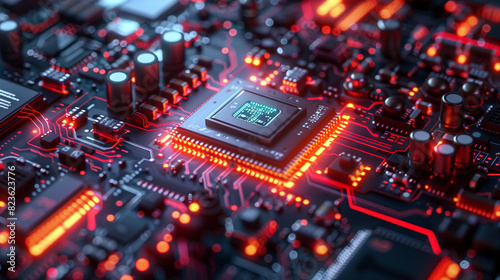 High-tech close-up of an illuminated circuit board showcasing intricate electronic components and glowing pathways.