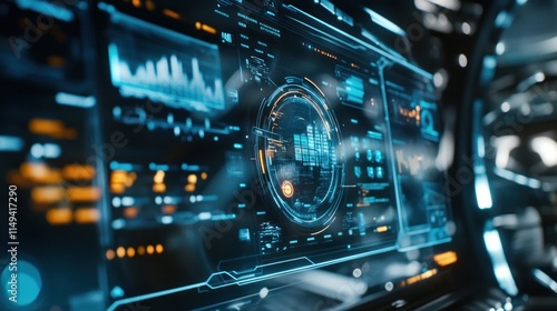 High-tech cockpit display with charts, graphs, and digital interfaces.