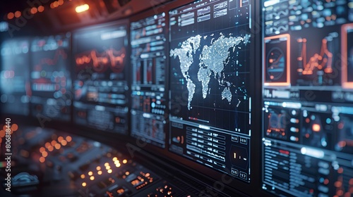 High-Tech Command Center with Global Monitoring Capabilities,Detailed view of a high-tech command center equipped with advanced monitoring systems and glowing red interfaces showcasing global data.
