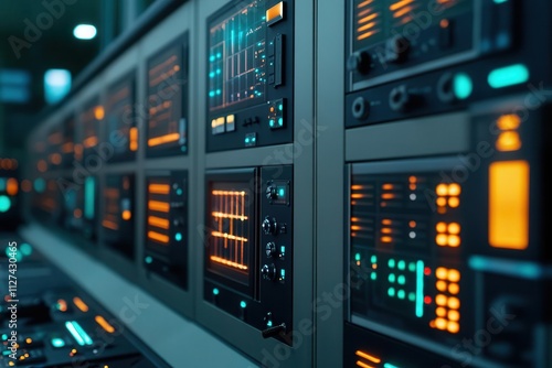 High-tech control room filled with glowing fiber optic panels and advanced equipment