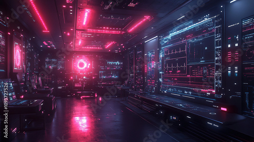 High-tech control room illuminated with red and blue lights showcases advanced digital interfaces and equipment. Generative AI