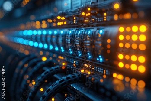 High-Tech Cyberpunk Network Switch with Ethernet Cables in Data Center