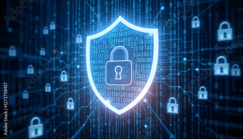 High-Tech Cybersecurity Concept with Glowing Shield and Lock on Matrix Background