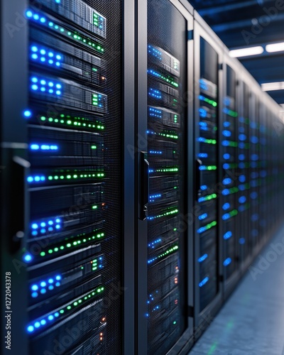 High-Tech Data Center with Blinking Servers and Colorful LED Lights in a Modern IT Infrastructure Setting