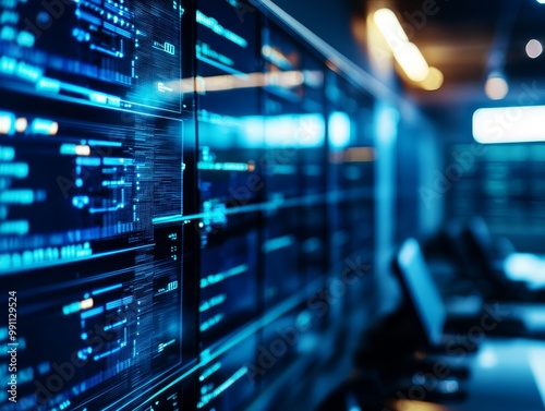 High-tech data center with illuminated screens and modern design.