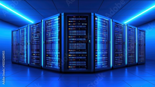 High-tech data center with server racks glowing in blue light, showcasing modern technology.