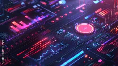 High-tech digital interface with abstract data, charts, and glowing elements. Ideal for tech, data visualization, and futuristic concepts.
