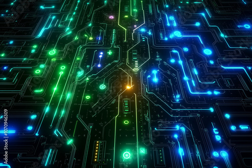 High-tech futuristic pattern with glowing circuit paths, symmetrical composition, neon blue and green colors on a dark gradient background