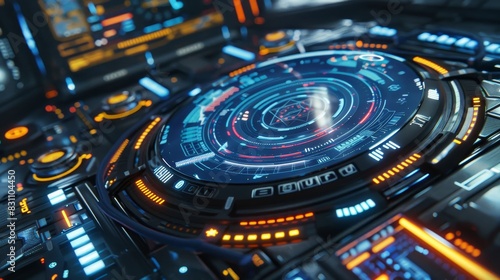 High-tech futuristic user interface dashboard with vibrant holographic display and digital control elements for advanced technology design.