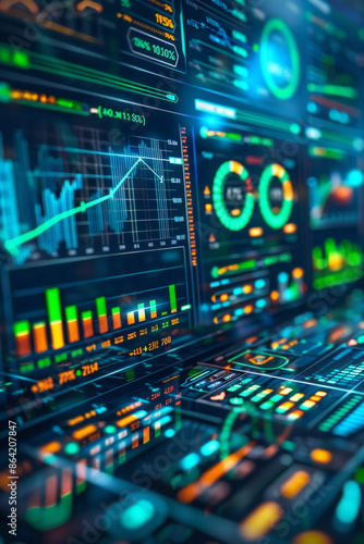 High-tech investment dashboard with glowing graphs and charts in blue and green colors.