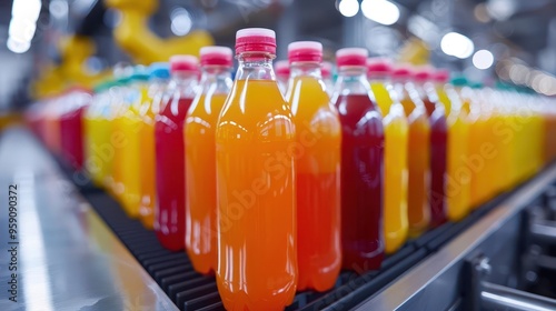 hightech juice bottling facility with robotic arms conveyor belts and quality control scanners bottles filled with vibrant fruit juices