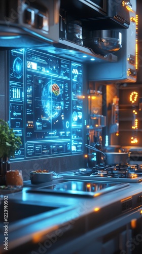 High-tech kitchen with smart appliances and glowing holographic recipe interface