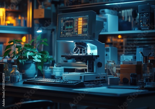 High-tech laboratory with an advanced digital microscope in ambient lighting.