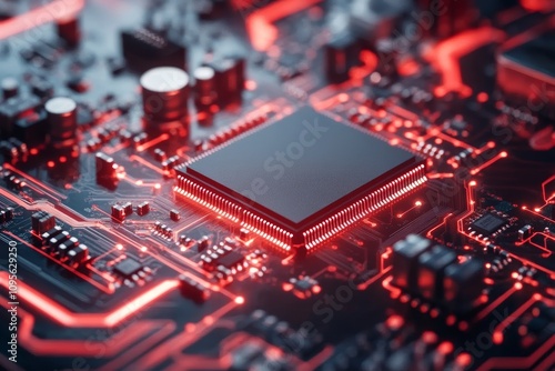 High-tech microchip on red circuit board with glowing traces