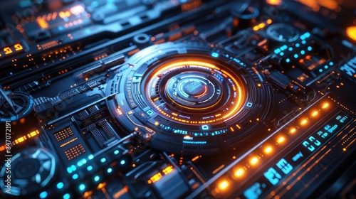 High-Tech Poster Vision A sleek, futuristic poster mockup shimmers with luminous neon accents and textured metallic surfaces, offering a glimpse into a world of advanced technology and captivating de
