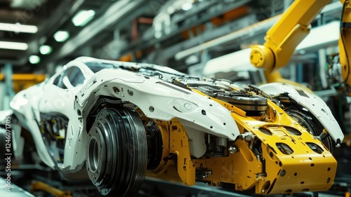 High-tech robotic arms assemble a car in an advanced manufacturing facility with precision and efficiency during daytime operations