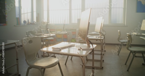 High-Tech School Computer Lab with Minimalist Furniture and PC Monitors. Modern Classroom Setup Ready for Students to Practice Coding, Design, STEM Projects and Innovative Digital Learning. Dolly Shot