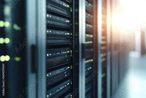 High-tech server racks in a secure data center with illuminated green indicator lights and sleek hardware, ideal for cloud computing, networking, or IT infrastructure concepts