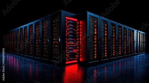 High-tech server room filled with multiple racks of servers and brightly lit network equipment