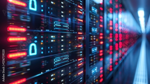 High-tech server room with illuminated racks, showcasing advanced data processing technology