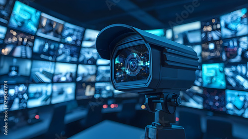 High-Tech Surveillance Camera with Control Room Background