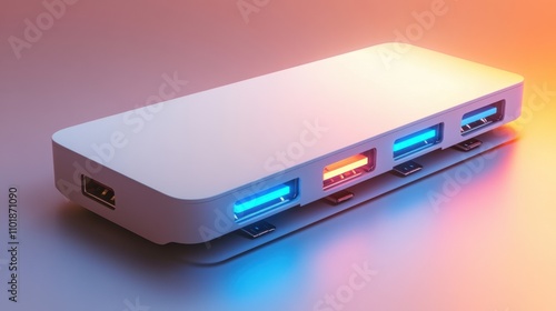 High-tech USB-C hub with multiple connections, rendered in 3D for a clean, futuristic aesthetic against a soft gradient.