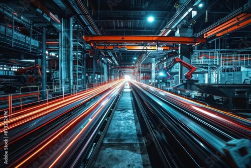 hightech warehouse interior with streaks of light from robotic arms and conveyor belts creating a futuristic ballet of efficiency and automation