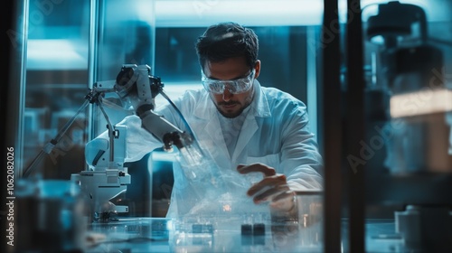 High-tech work office laboratory, people and robots working together, future technologies, artificial intelligence