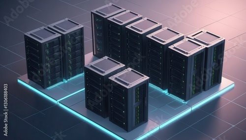 High-Technology Data Center Setup with Multiple Server Racks in a Modern Office Environment Featuring Neon Accents and Illuminated Floor Tiles