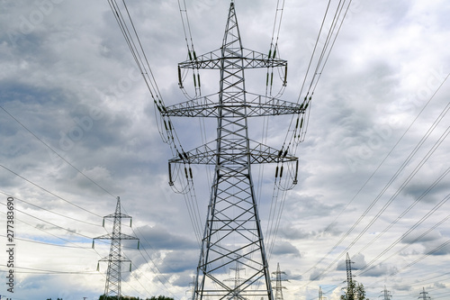 High-voltage power lines. Cloudy sky before a thunderstorm.