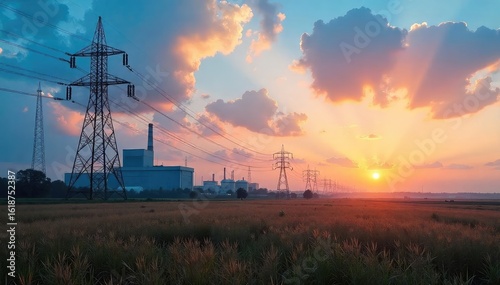 High-Voltage Power Lines Spanning a Vast Landscape, Leading to a Modern Power Plant