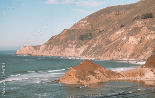 Highway 1 and Big Sur along the Pacific Ocean coast, beautiful landscape and aerial view, sunset, sunrise, fog. Concept, travel, vacation, weekend