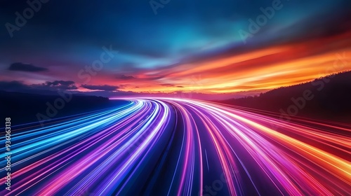 Highway Colorful Light Trails, Digital Marketing Speed Movement, Dark Blue Background, Orange-Toned Sunset Sky