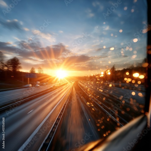 Highway Sunset: A Blur of Motion and Light Through the Windshield, Capturing Speed and the Beauty of Travel