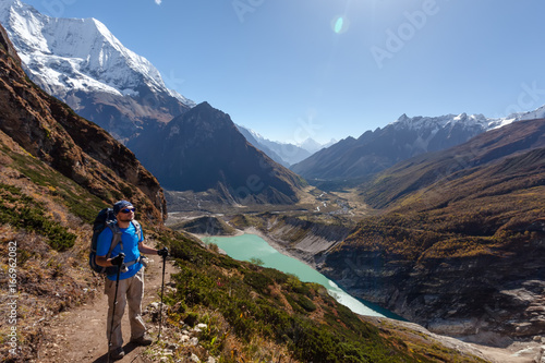 Hiker is climbig to Manaslu base camp in highlands of Himalayas on Manaslu circuit