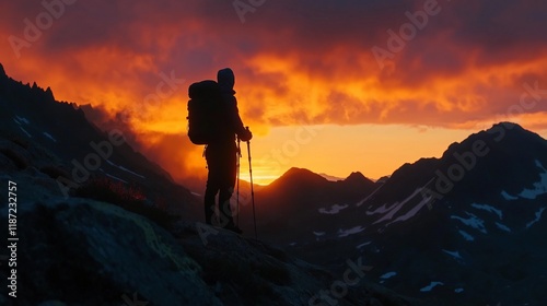 hiker silhouetted against the setting sun on a high mountain ridge, with clouds glowing orange and pink