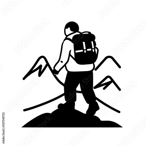 Hiker with a backpack exploring mountainous terrain in a vector art design