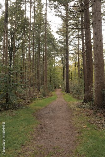 Hiking trail path fall forest with tall trees and fallen autumn leaves on the ground.