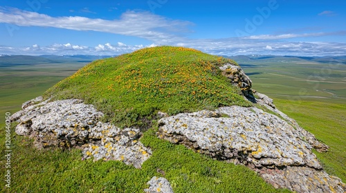 Hilltop wildflowers, grassy plains, sunny sky, landscape photography, nature scene